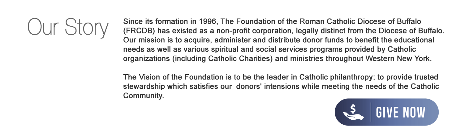 Since its formation in 1996, The Foundation of the Roman Catholic Diocese of Buffalo (FRCDB) has existed as a non-profit corporation, legally distinct from the Diocese of Buffalo. Our mission is to acquire, administer and distribute donor funds to benefit the educational needs as well as various spiritual and social services programs provided by Catholic organizations (including Catholic Charities) and ministries throughout Western New York.